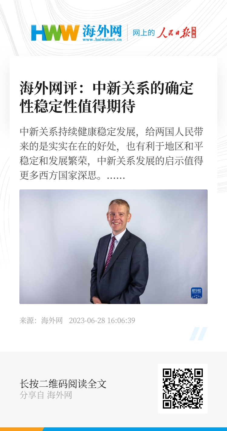 值得关注的是,路透社等多家外媒在报道希普金斯此次访华之旅时,普遍提及新西兰发展对华关系的独立自主性。新西兰前总理约翰·基接受媒体采访时表示,新西兰与美国、澳大利亚同属“五眼联盟”,但“这并不意味着我们不能与中国建立更加基于贸易的非常成功和繁荣的关系”。中新关系持续健康稳定发展,给两国人民带来的是实实在在的好处,也有利于地区和平稳定和发展繁荣,中新关系发展的启示值得更多西方国家深思。(栾雨石)