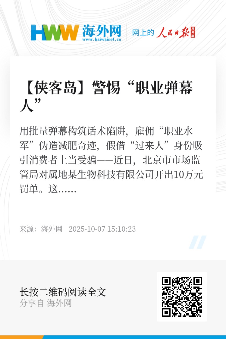 用批量弹幕构筑话术陷阱,雇佣“职业水军”伪造减肥奇迹,假借“过来人”身份吸引消费者上当受骗——近日,北京市市场监管局对属地某生物科技有限公司开出10万元罚单。