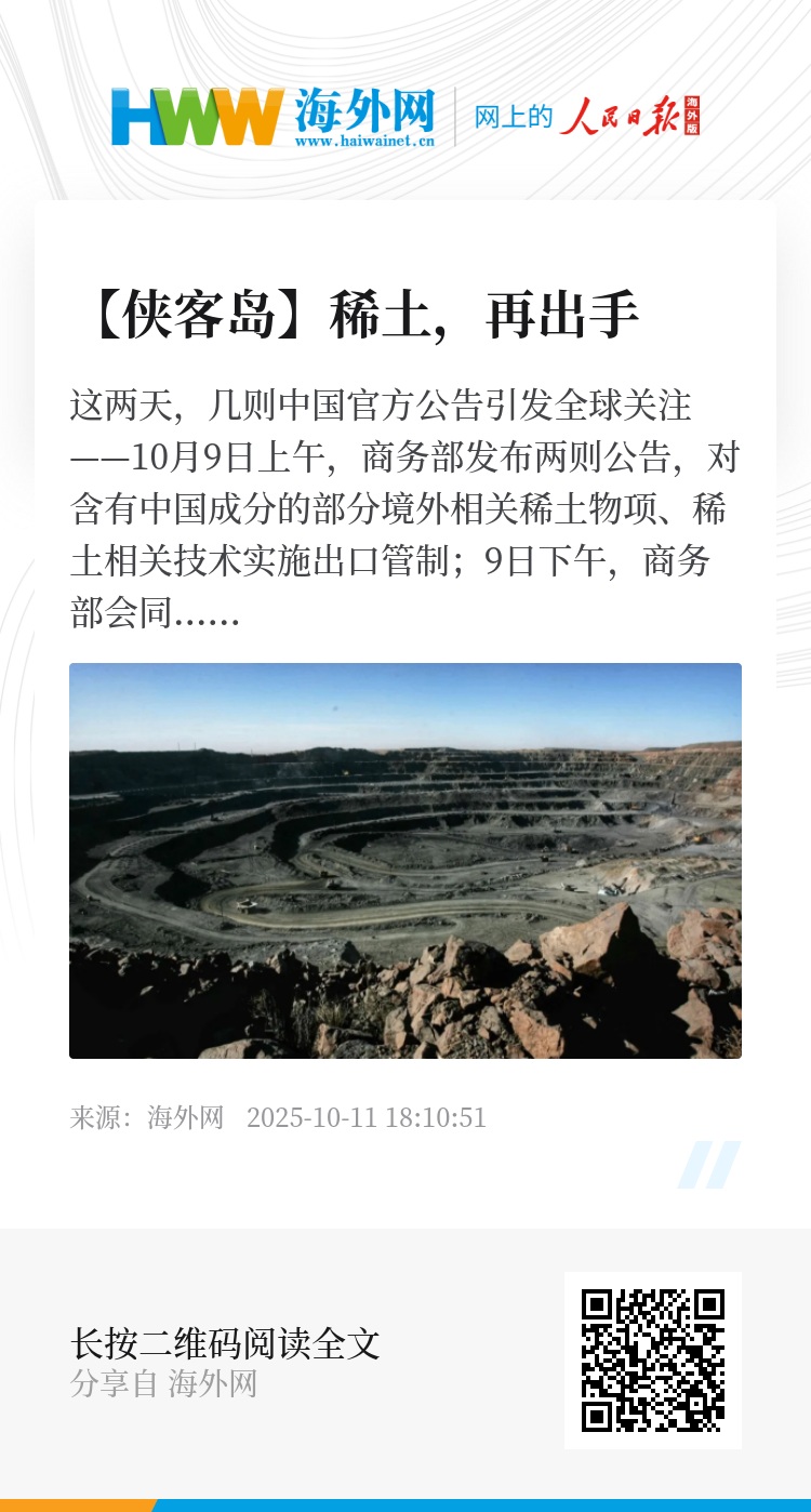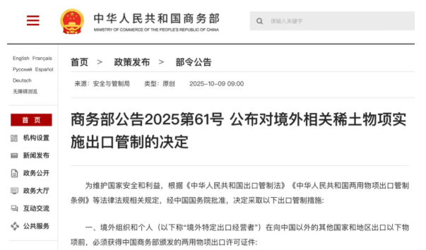 10月9日上午,商务部发布两则公告,对含有中国成分的部分境外相关稀土物项、稀土相关技术实施出口管制;