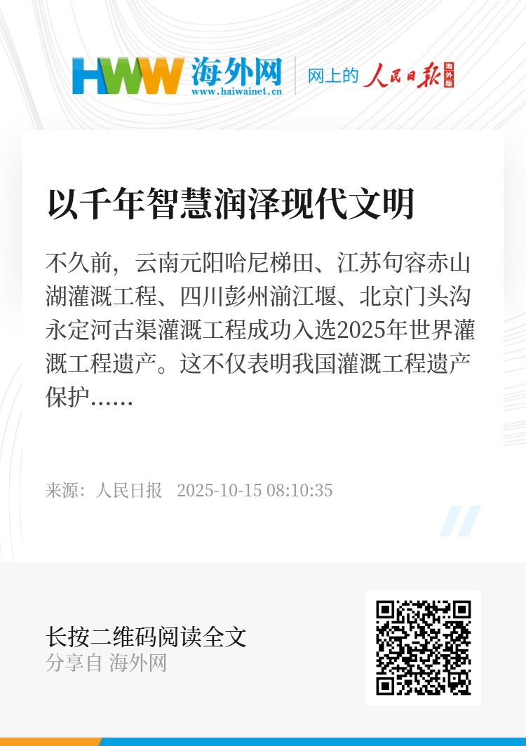 不久前,云南元阳哈尼梯田、江苏句容赤山湖灌溉工程、四川彭州湔江堰、北京门头沟永定河古渠灌溉工程成功入选2025年世界灌溉工程遗产。这不仅表明我国灌溉工程遗产保护获得国际认可,也意味着我国世界级遗产再度扩容。
