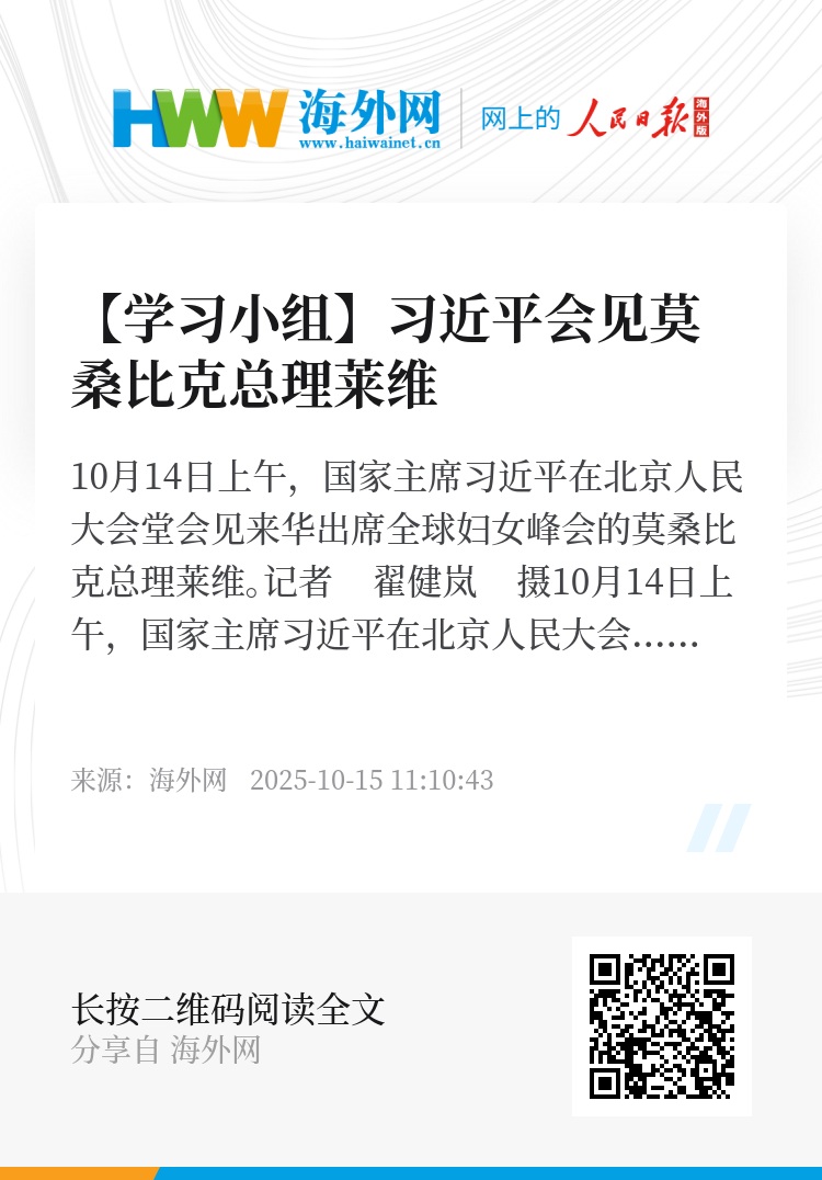10月14日上午,国家主席习近平在北京人民大会堂会见来华出席全球妇女峰会的莫桑比克总理莱维。