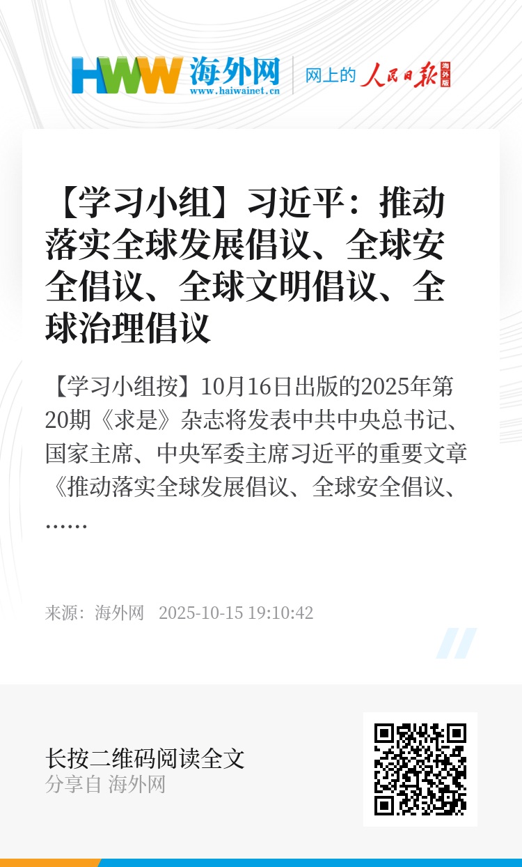 10月16日出版的2025年第20期《求是》杂志将发表中共中央总书记、国家主席、中央军委主席习近平的重要文章《推动落实全球发展倡议、全球安全倡议、全球文明倡议、全球治理倡议》。这是习近平总书记2021年9月至2025年9月期间有关重要论述的节录。请看全文。