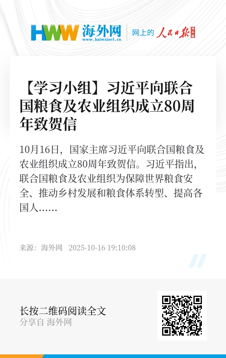 10月16日,国家主席习近平向联合国粮食及农业组织成立80周年致贺信。