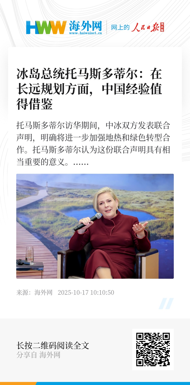 冰岛总统哈德拉·托马斯多蒂尔于2025年10月12日至18日访华。在冰岛驻华大使馆日前举办的炉边对话会上,托马斯多蒂尔表示,面对动荡不安的世界,冰方愿同中方加强沟通和协调,共同应对全球性挑战。“在长远规划这件事上,世界上大多数国家或许都能从中国的经验中借鉴一二。”托马斯多蒂尔说。