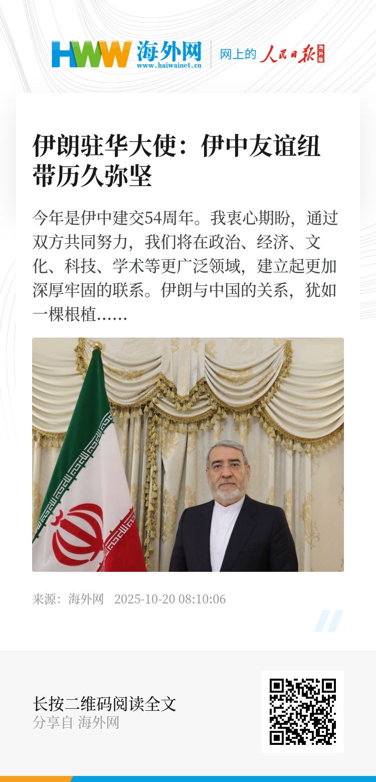 今年是伊中建交54周年。我衷心期盼,通过双方共同努力,我们将在政治、经济、文化、科技、学术等更广泛领域,建立起更加深厚牢固的联系。伊朗与中国的关系,犹如一棵根植历史、枝繁叶茂的参天古树,正向着广阔的未来生生不息地延展。我们的使命,正是用心浇灌这棵苍翠挺拔的友谊之树,守护其茁壮成长,让子孙后代共享其丰硕果实。