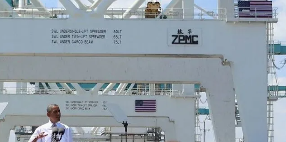 2013年,时任美国总统奥巴马在迈阿密港口发表演讲,大谈“美国制造”。一阵风吹落了奥巴马身后港口起重机上的美国国旗,露出“振华ZPMC”标志。