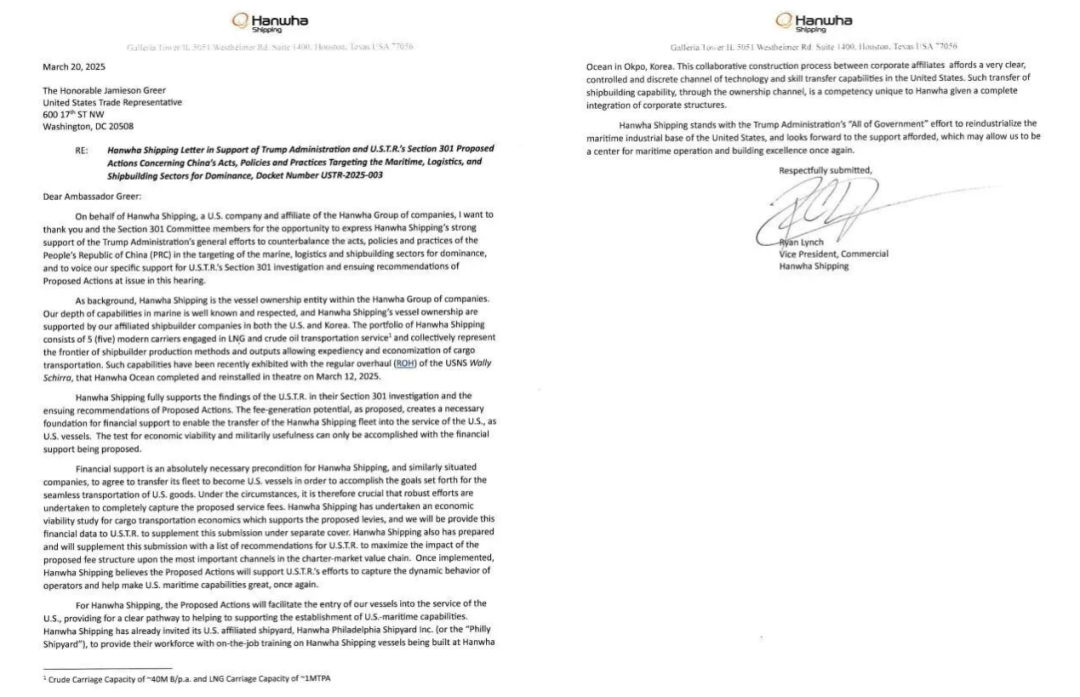 今年3月,这家韩国船企的在美子公司致函美国贸易代表办公室,说“强烈支持”旨在削弱中国海事、物流和造船业地位的对华301调查和限制措施,还提供了一系列财务数据和政策建议,支持其船队成为“美国船舶”并满足美国需求(包括声称的经济和军事效用)。