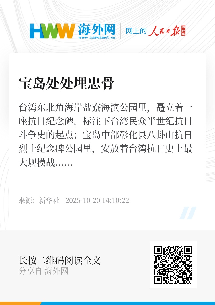 台湾东北角海岸盐寮海滨公园里,矗立着一座抗日纪念碑,标注下台湾民众半世纪抗日斗争史的起点;宝岛中部彰化县八卦山抗日烈士纪念碑公园里,安放着台湾抗日史上最大规模战役“八卦山会战”牺牲烈士的遗骨;在台南山间的玉井一带,“噍吧哖起义抗日烈士纪念碑”和“抗日烈士余清芳纪念碑”隔山相望,见证日据时期持续时间最长的武装抗日行动……