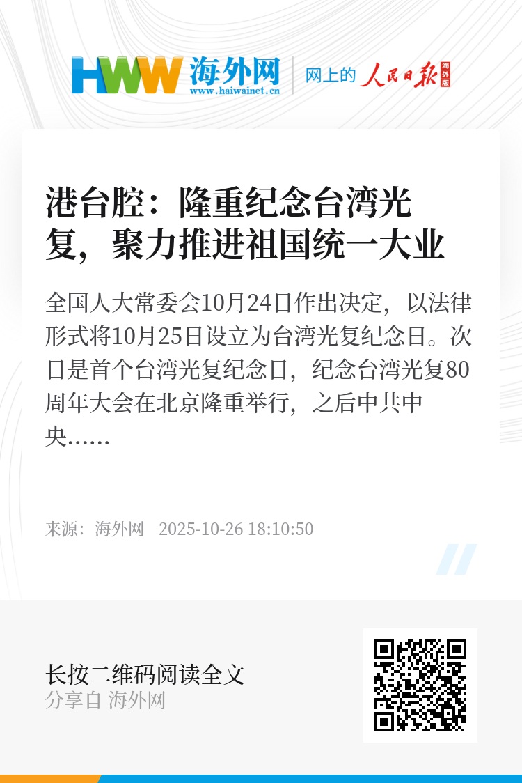 全国人大常委会10月24日作出决定,以法律形式将10月25日设立为台湾光复纪念日。次日是首个台湾光复纪念日,纪念台湾光复80周年大会在北京隆重举行,之后中共中央台办、国务院台办又举办设立台湾光复纪念日招待会。党和国家隆重纪念台湾光复,反映了包括台湾同胞在内的海内外中华儿女的共同愿望,宣示了中国共产党、中国政府、中国人民坚持一个中国原则和捍卫国家统一、主权、领土完整,以及矢志不渝完成历史任务、坚定不移推进祖国统一大业的坚定意志,必将激励海内外中华儿女更加坚决反对“台独”分裂和外来干涉,更加积极投身祖国统一、民族复兴的千秋伟业。
