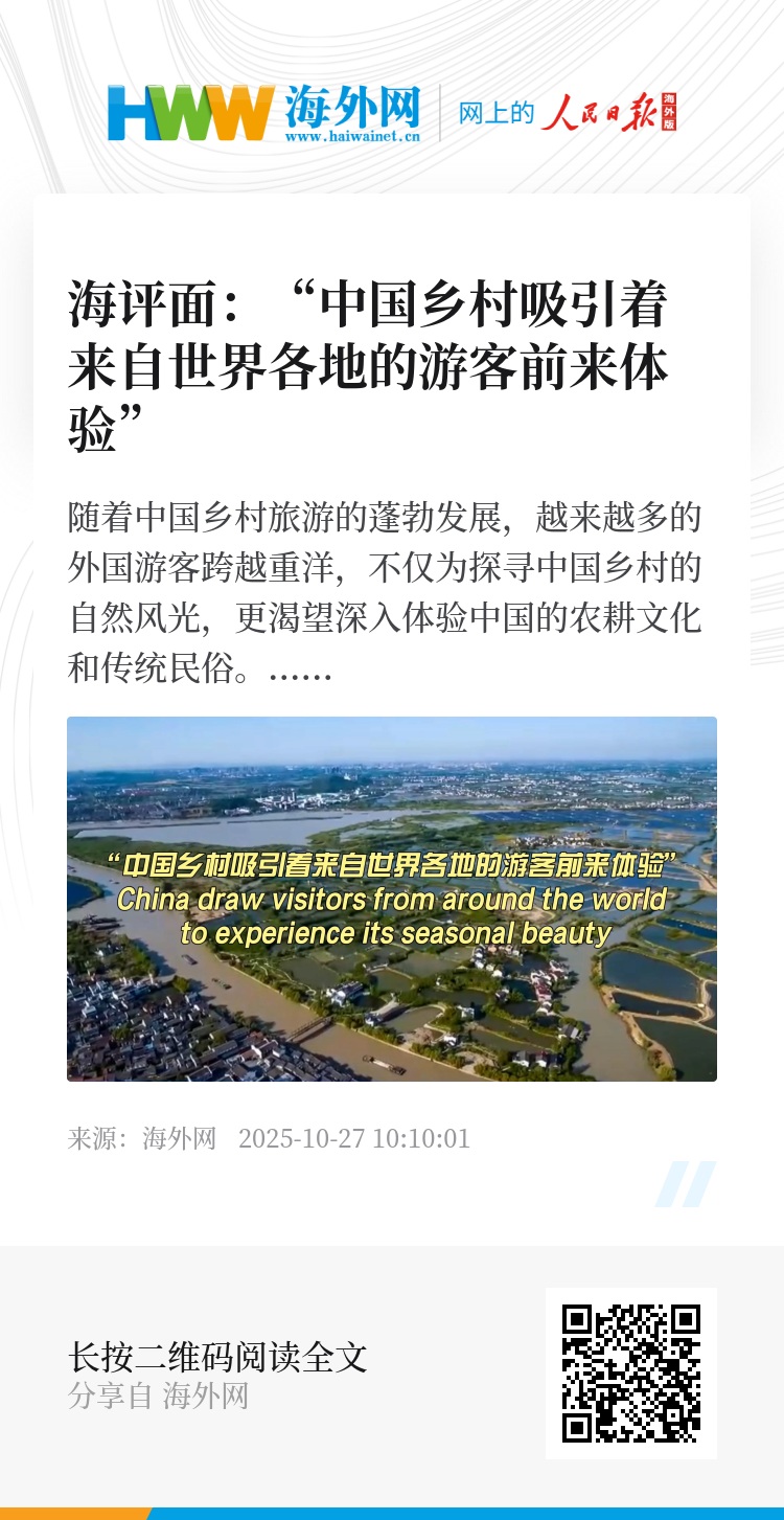 如今,中国作为国际旅游目的地的吸引力显著提升。国家移民管理局最新数据显示,三季度,全国移民管理机构累计查验出入境人员1.78亿人次,同比上升12.9%。美国旅行和旅游网刊文称,中国乡村令人叹为观止的秋日景致、活力四射的节日庆典以及丰富的文化遗产,吸引着来自世界各地的游客前来体验。奥德利旅行公司中国区产品经理劳伦·科波拉也注意到,旅客对中国的兴趣日益增长。“我们收到了许多关于中国的咨询,比去年同期增加了不少。客户们非常关心在新的过境签证规定下,他们能够访问哪些地方。”