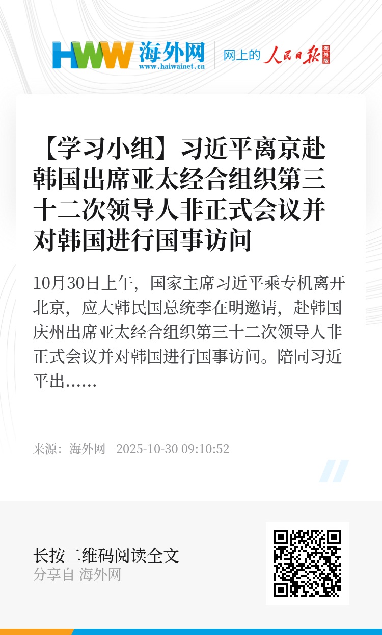 10月30日上午,国家主席习近平乘专机离开北京,应大韩民国总统李在明邀请,赴韩国庆州出席亚太经合组织第三十二次领导人非正式会议并对韩国进行国事访问。