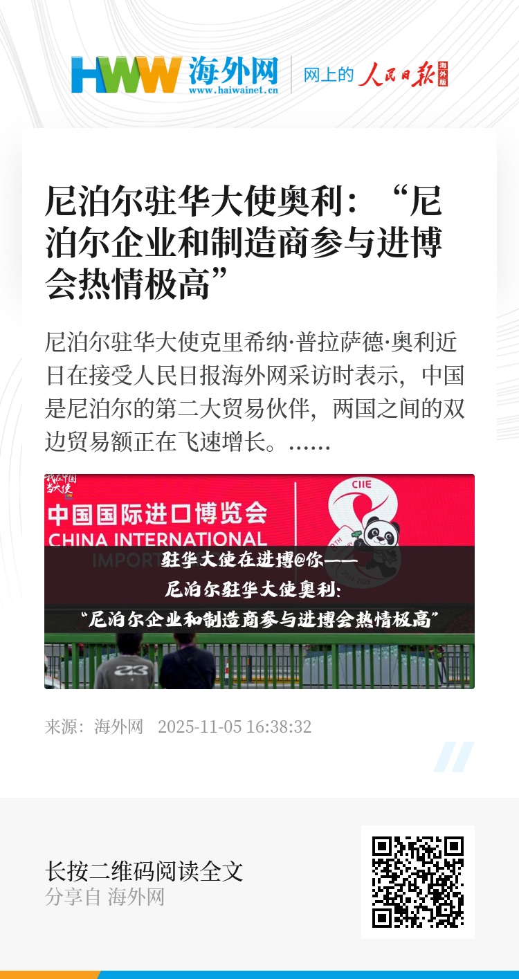 第八届中国国际进口博览会于11月5日在上海开幕。尼泊尔驻华大使克里希纳·普拉萨德·奥利近日在接受人民日报海外网采访时表示,中国是尼泊尔的第二大贸易伙伴,两国之间的双边贸易额正在飞速增长。