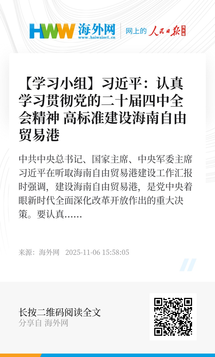 中共中央总书记、国家主席、中央军委主席习近平在听取海南自由贸易港建设工作汇报时强调,建设海南自由贸易港,是党中央着眼新时代全面深化改革开放作出的重大决策。要认真学习贯彻党的二十届四中全会精神,在党中央集中统一领导下,各级各有关方面密切协作、主动作为,通过持续努力,全面实现海南自由贸易港建设目标。