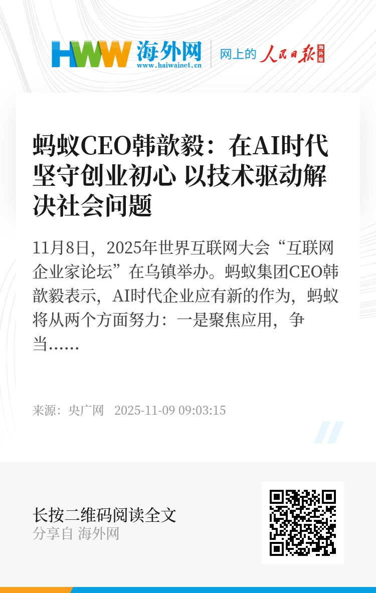 11月8日,2025年世界互联网大会“互联网企业家论坛”在乌镇举办。蚂蚁集团CEO韩歆毅表示,AI时代企业应有新的作为,蚂蚁将从两个方面努力:一是聚焦应用,争当科技创新主力,尤其在AI健康应用上笃定方向,全力以赴;二是开放互联,服务全球交流与合作,助力全球消费者一个钱包走天下,也助力中小企业便捷参与全球贸易。