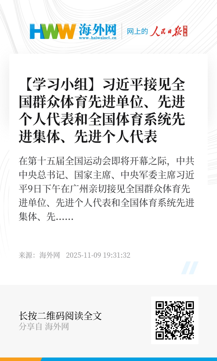 在第十五届全国运动会即将开幕之际,中共中央总书记、国家主席、中央军委主席习近平9日下午在广州亲切接见全国群众体育先进单位、先进个人代表和全国体育系统先进集体、先进个人代表,向他们表示热烈祝贺,勉励他们奋力拼搏、再创佳绩,为建设体育强国作出新贡献。