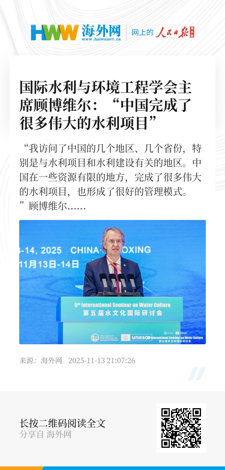 2025年11月13日,第五届水文化国际研讨会在浙江省绍兴召开,国际水利与环境工程学会主席菲利普·顾博维尔出席活动。在接受人民日报海外网采访时他表示,对绍兴的第一印象是这里的自然环境质量。绍兴是一个美丽的城市,有很多历史建筑,有着非常古老的传统。这非常令人印象深刻,它们得到了很好地保护。