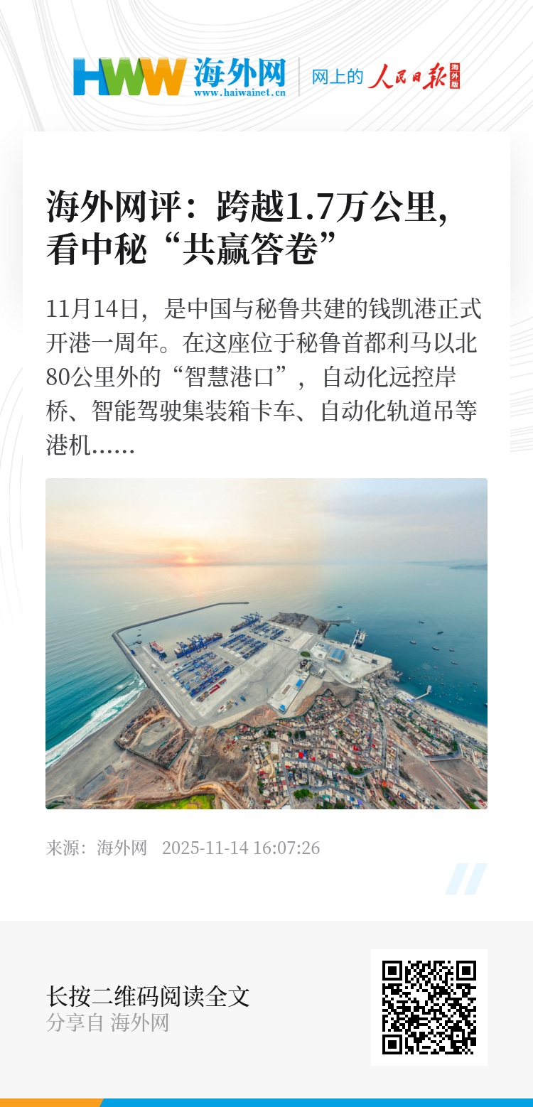 11月14日,是中国与秘鲁共建的钱凯港正式开港一周年。在这座位于秘鲁首都利马以北80公里外的“智慧港口”,自动化远控岸桥、智能驾驶集装箱卡车、自动化轨道吊等港机设备正高效运转。往来奔流在两国的商品,承载的不仅是对繁荣的期许,更是两国人民对美好生活的共同向往。