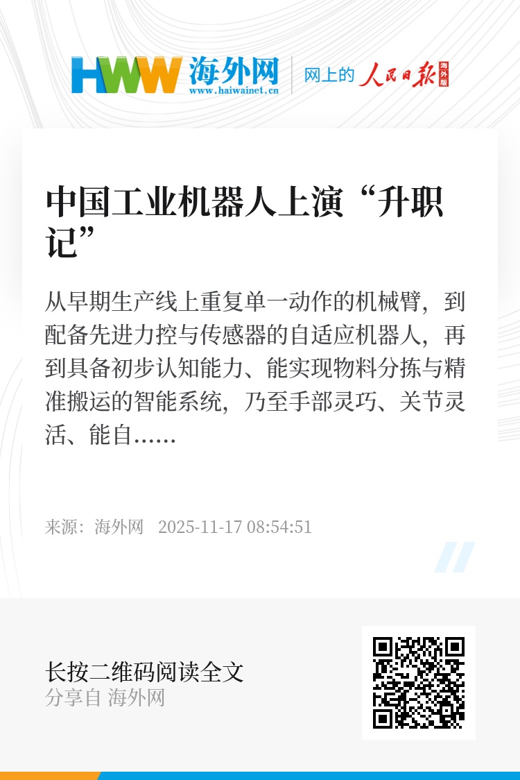 中国工厂里发生的变化,持续引发外媒关注。多家外媒表示,中国工业机器人正实现从产线“配角”到新一代“劳动力”的转变,其创新迭代深刻改变了全球智能制造的格局。