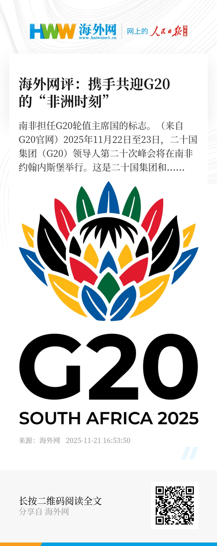 此次 G20 非洲峰会的历史性意义不言而喻,相信在人类命运共同体理念的指引下,中国与G20各方的将携手努力,为全球治理注入非洲活力与发展动能,推动多边合作在团结平等中迈向更可持续的未来。(海外网评论员)