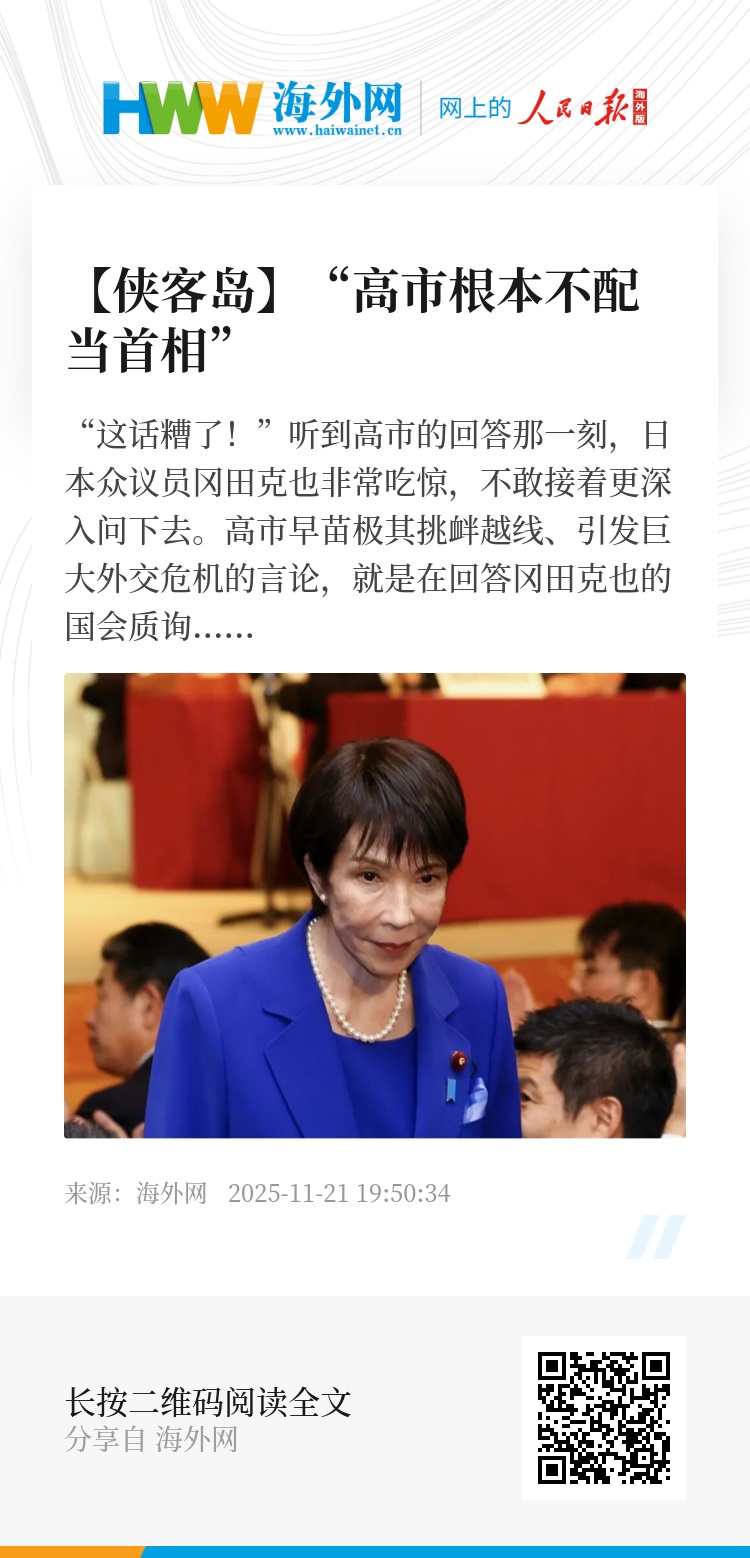 在他看来,日本首相绝不能说出这种“出格越界的言论”,他对高市“是否具备在复杂局势下担任首相的资质”表示质疑。
