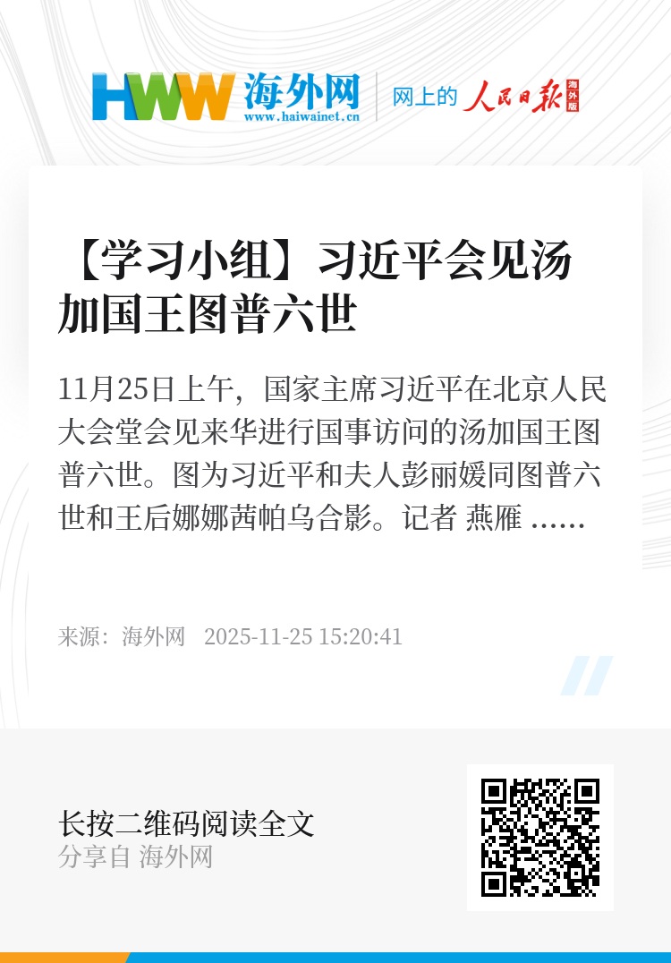 习近平强调,中共二十届四中全会对中国未来5年经济社会发展作出顶层设计和战略擘画。中国将聚焦高质量发展,进一步全面深化改革,扩大高水平对外开放,同世界各国共享发展机遇。中方提出四大全球倡议,就是要推动世界各国共谋发展、共享和平。愿同汤加共同践行四大全球倡议,为两国人民创造更加美好的生活,共建中国-太平洋岛国命运共同体,推动构建人类命运共同体。
