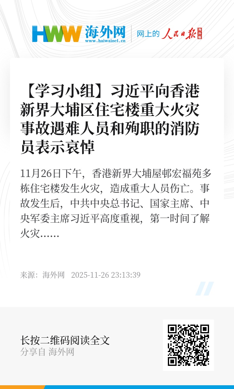 原标题/习近平向香港新界大埔区住宅楼重大火灾事故遇难人员和殉职的消防员表示哀悼 对遇难者家属和受灾人员表示慰问 要求全力以赴扑灭火灾 努力把火灾伤亡损失降到最低