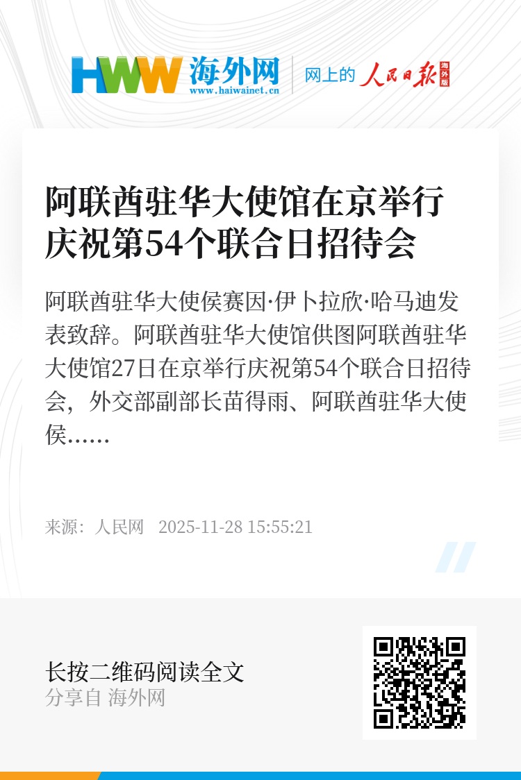 阿联酋驻华大使馆27日在京举行庆祝第54个联合日招待会,外交部副部长苗得雨、阿联酋驻华大使侯赛因·伊卜拉欣·哈马迪,驻京外交使团、阿联酋及阿拉伯侨民、中国商业及民间社会等各界代表出席。