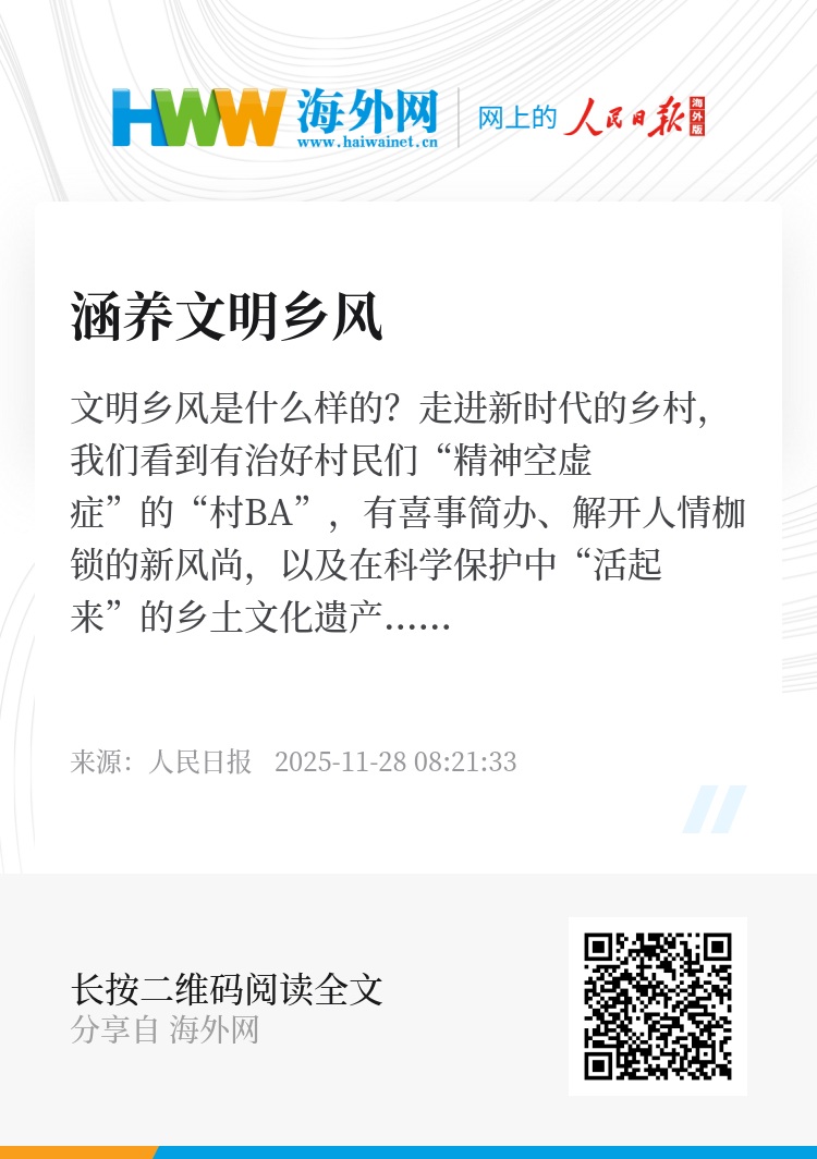 文明,让乡村更美好。加强农村精神文明建设,持续发挥其滋润人心、德化人心、凝聚人心的作用,促进乡村由表及里、形神兼备的全面提升,将沉淀更多回味悠长的乡愁记忆。(郁静娴)