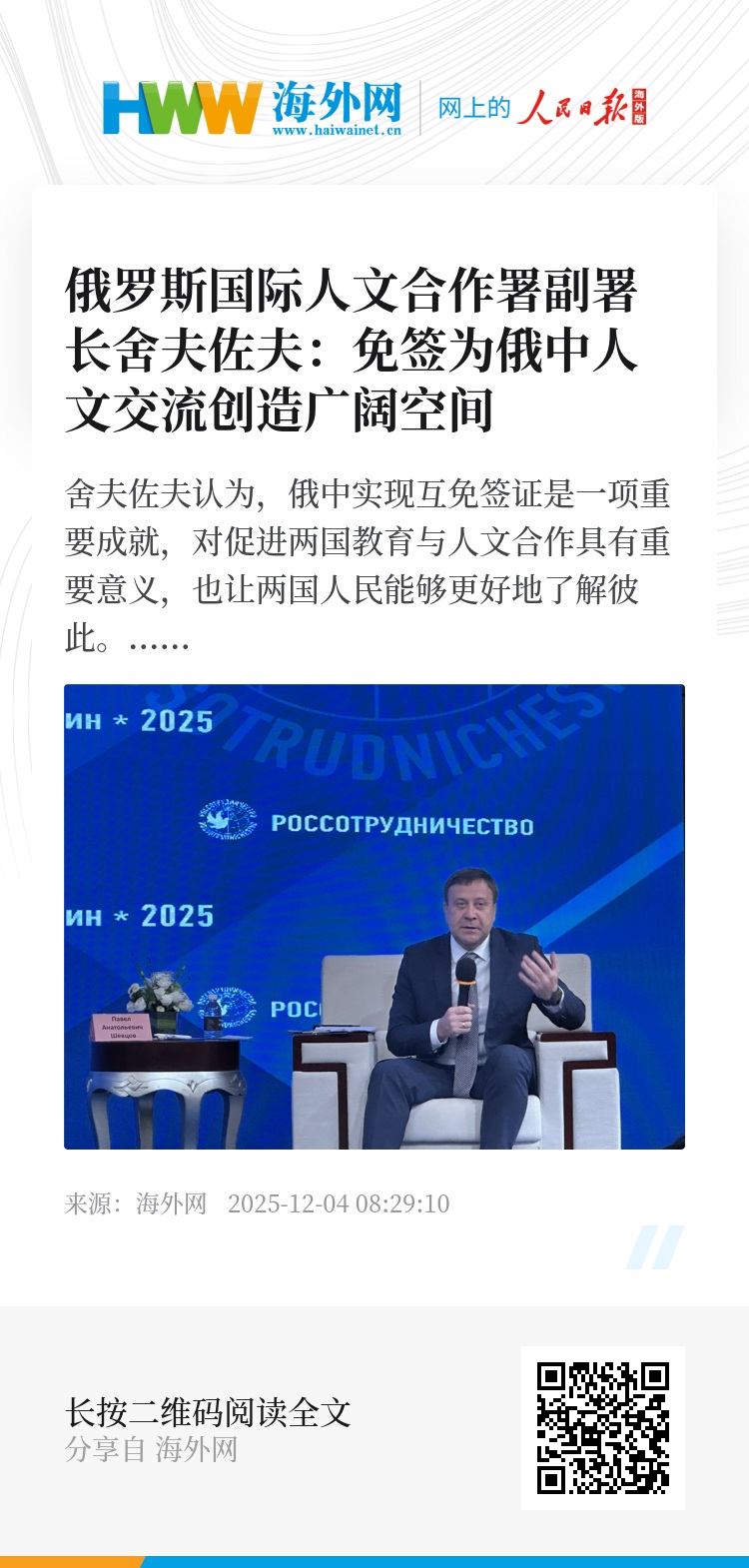 俄罗斯针对中国公民的赴俄免签政策近日生效。俄罗斯联邦独联体事务、俄侨和国际人文合作署副署长帕维尔·舍夫佐夫12月2日在接受人民日报海外网采访时表示,免签政策将为俄中两国关系的发展创造广阔的人文交流空间。