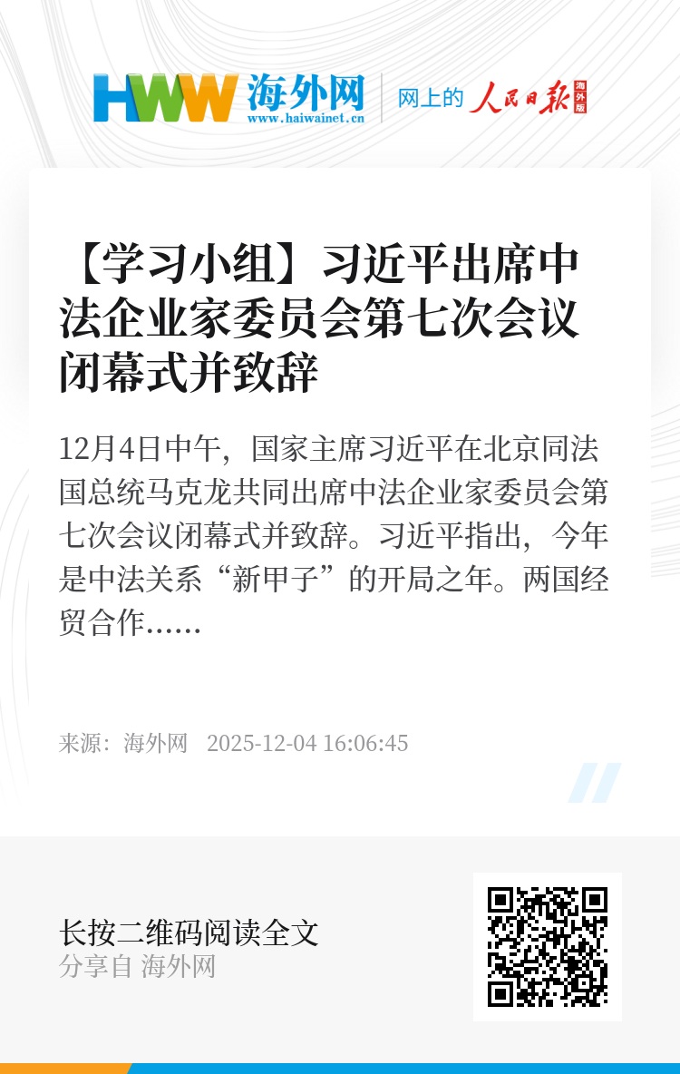 习近平强调,中共二十届四中全会审议通过了“十五五”规划建议。中国将全面推进中国式现代化,扩大高水平对外开放。欢迎法国企业家继续共享中国发展红利。