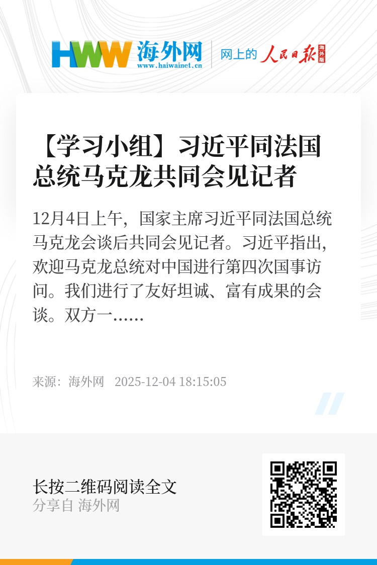 习近平强调,对外开放是中国的基本国策,中国开放的大门只会越开越大。“十五五”期间,中国将以全面深化改革推动高质量发展,深入实施扩大内需战略,扩大市场准入和开放领域,还将引导产业链供应链合理有序跨境布局。这将为中法务实合作和中法关系发展开辟更广阔空间。中国愿同法国一道,共促发展、共筑和平、共赢未来,朝着构建人类命运共同体方向不断迈进。
