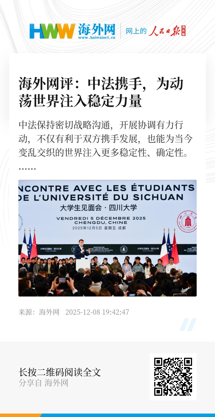 2025年是中法关系“新甲子”开局之年。不久前,法国总统马克龙应邀来华进行国事访问,并在访华期间与中方就加强全球治理、合作应对全球气候和环境挑战、持续推进和平利用核能领域合作、农业和食品交流与合作、乌克兰局势和巴勒斯坦局势发表了联合声明。中法保持密切战略沟通,开展协调有力行动,不仅有利于双方携手发展,也能为当今变乱交织的世界注入更多稳定性、确定性。