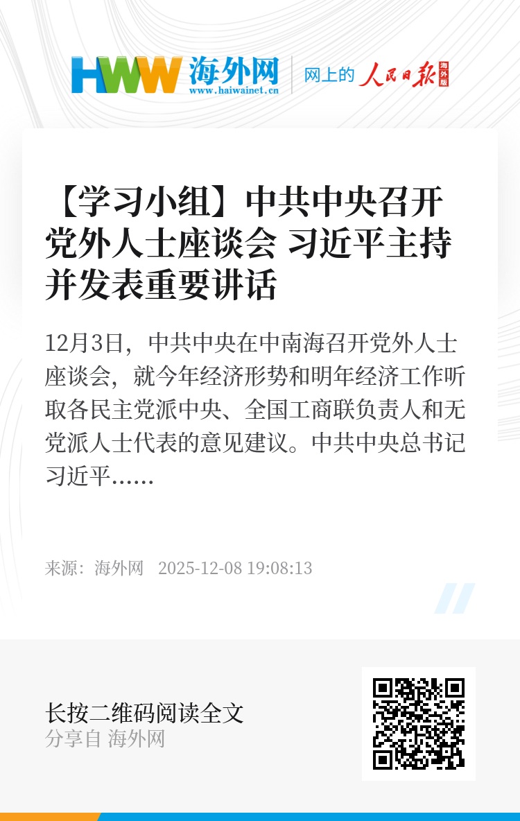 12月3日,中共中央在中南海召开党外人士座谈会,就今年经济形势和明年经济工作听取各民主党派中央、全国工商联负责人和无党派人士代表的意见建议。中共中央总书记习近平主持座谈会并发表重要讲话强调,我国经济长期向好的支撑条件和基本趋势没有改变,要坚定信心、用好优势、应对挑战,不断巩固拓展经济稳中向好势头,实现“十五五”良好开局。
