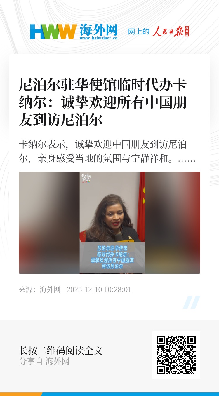 12月9日,尼泊尔驻华大使馆举办瑜伽与冥想文化体验活动。尼泊尔驻华大使馆临时代办罗珊·卡纳尔在接受人民日报海外网采访时表示,尼中是友好邻邦,今年共同庆祝了建交70周年,并在华举办“尼泊尔旅游年”活动。“中尼两国人民相亲相爱,始终保持着深厚情谊。”卡纳尔表示,诚挚欢迎中国朋友到访尼泊尔,亲身感受当地的氛围与宁静祥和。