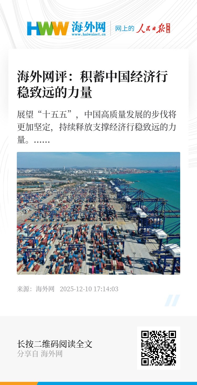 回顾“十四五”,中国经济稳中有进,跃上新台阶。从经济总量稳步攀升到消费市场展现蓬勃活力,从科技创新持续涌现到产业结构深度优化,高质量发展正不断释放出推动中国经济大船行稳致远的“蓬勃动能”。展望“十五五”,中国高质量发展的步伐将更加坚定,持续释放支撑经济行稳致远的力量。(海外网评论员)