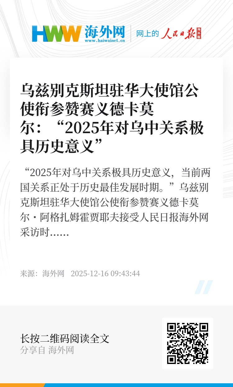 “2025年对乌中关系极具历史意义,当前两国关系正处于历史最佳发展时期。”乌兹别克斯坦驻华大使馆公使衔参赞赛义德卡莫尔・阿格扎姆霍贾耶夫接受人民日报海外网采访时表示,当前乌中各领域合作取得了丰硕成果。