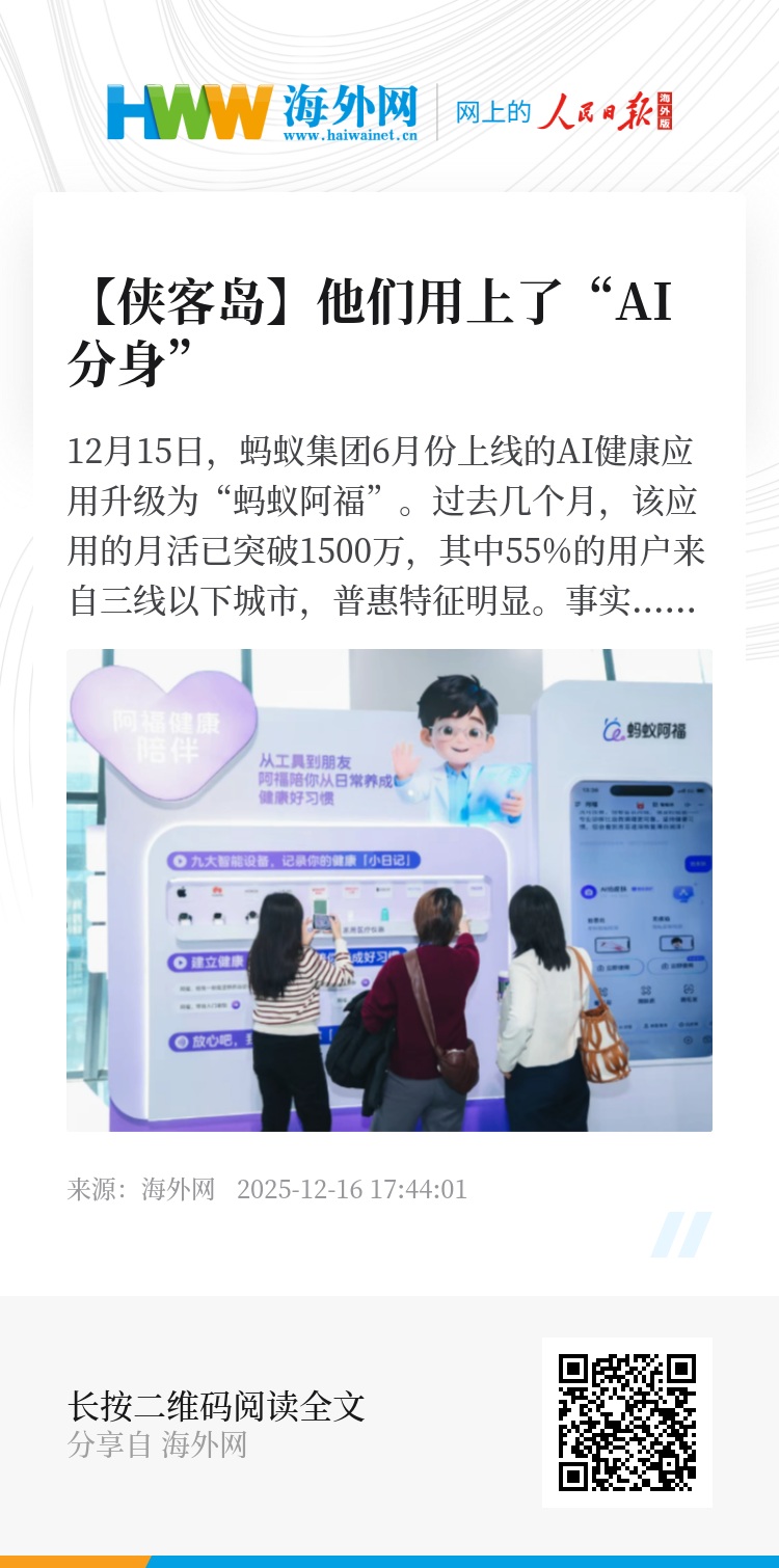 12月15日,蚂蚁集团6月份上线的AI健康应用升级为“蚂蚁阿福”。过去几个月,该应用的月活已突破1500万,其中55%的用户来自三线以下城市,普惠特征明显。
