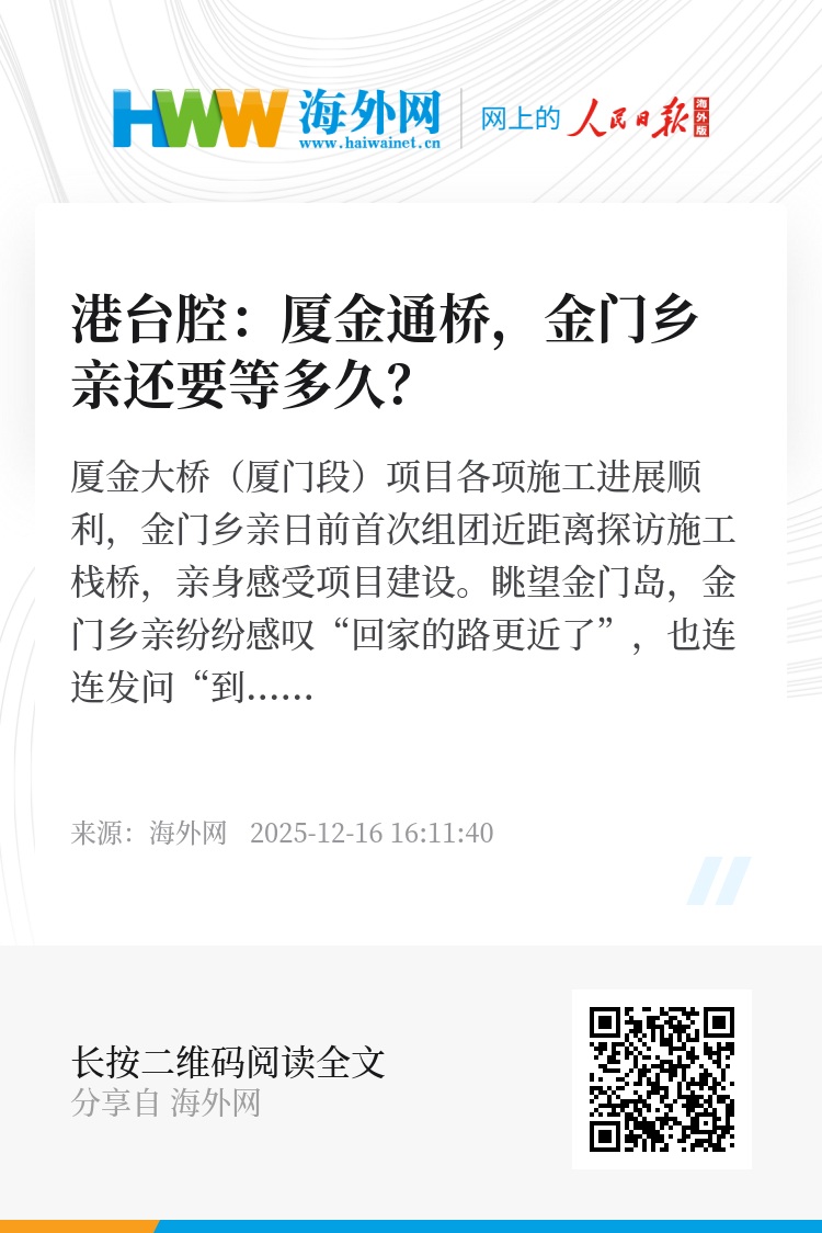 此番登桥参观的金门乡亲中有金门县前县长李炷烽,这位曾为供水工程奔波20余年的老人,如今最大的愿望便是两岸往来能如家中拧开水龙头般方便。“通桥、通车、通心,万事皆通”,这也是广大金门民众的心声。金门乡亲对美好生活的向往、两岸同胞走近走亲的强烈意愿,绝非任何力量所能压制。奉劝民进党当局正视金门乡亲的利益诉求,停止政治算计,支持厦金大桥早日建成通车。(张 盼)