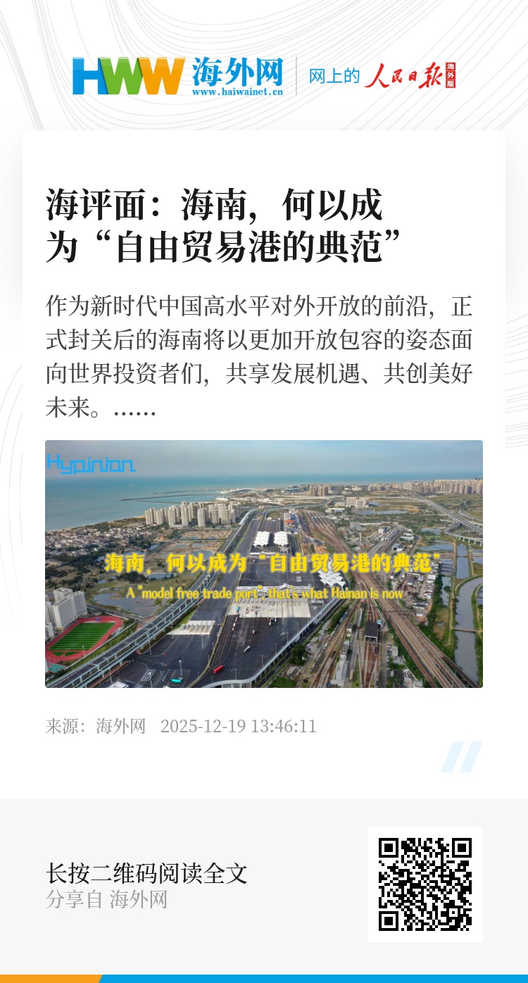 开启面向全球的“机遇之门”。自2020年来,已有超过170个国家和地区在琼投资,新增的外资企业超9600家。如今,海南自贸港实现货物进出更自由、更便利,“无感通关”成为常态;“零关税”政策全面落实,有力推动货物、人员、资金、数据等生产要素跨境高效流动;在人工智能等技术赋能下,港口、物流与产业深度协同,实现管理透明、运行高效。这份“封关答卷”,正吸引全球商界密切关注海南带来的新发展机遇。世界自由区组织首席执行官萨米尔·昂鲁尼在接受采访时表示,海南自贸港以完善的基础设施、高效的交通体系为支撑,近年来发展迅速,“拥有光明而广阔的未来。”开罗大学非洲研究学院研究员艾哈迈德·侯赛尼则认为,封关运作将进一步推动货物和服务自由流动,巩固海南贸易和物流枢纽地位,助力其成为“自由贸易港的典范”。