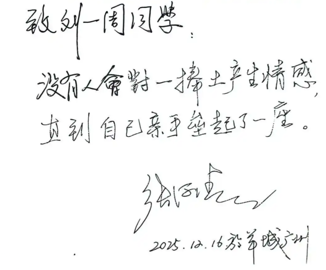 张河清手书“没有人会对一捧土产生情感,直到自己亲手垒起了一座”。(图源:羊城晚报)