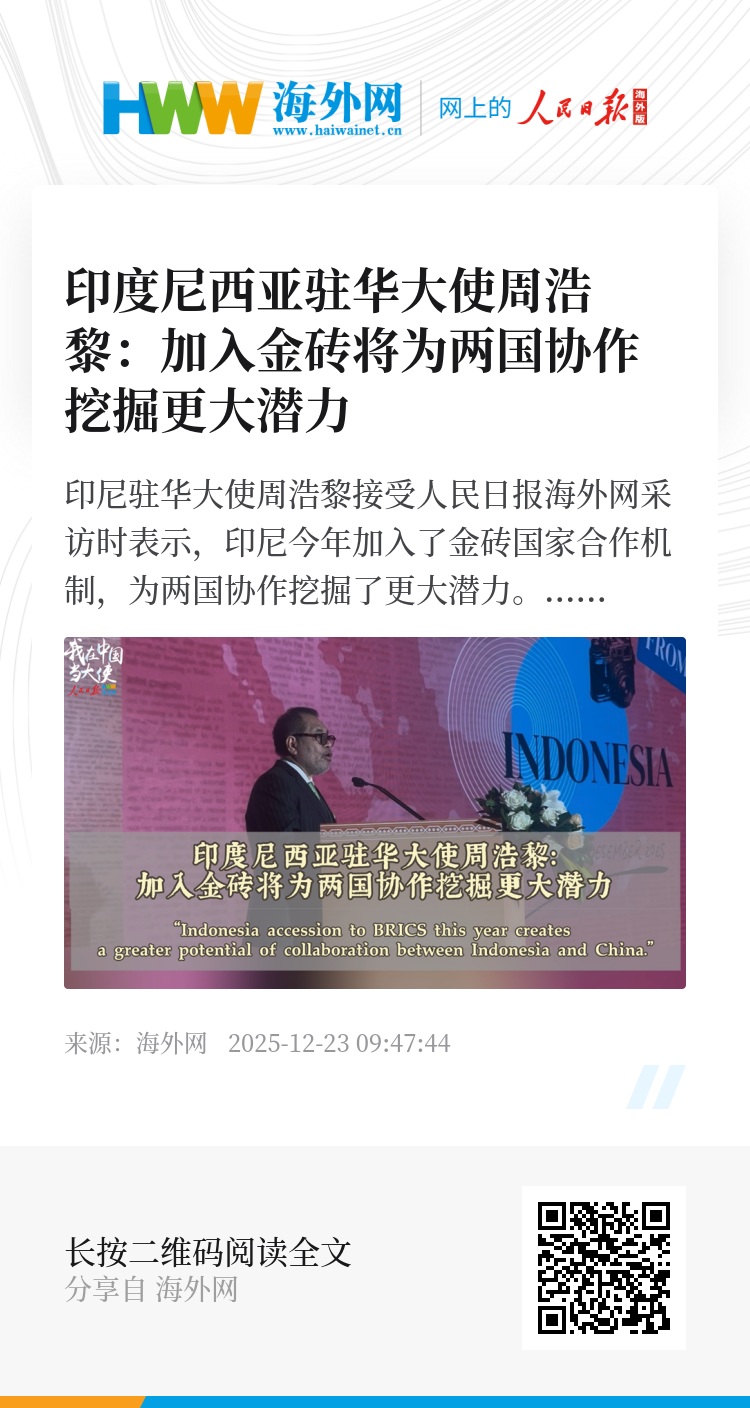 近日,印尼驻华使馆举办“印尼最新动态:深化合作纽带,共启新篇章”活动。印尼驻华大使周浩黎接受人民日报海外网采访时表示,印尼今年加入了金砖国家合作机制,为两国协作挖掘了更大潜力。在金砖框架下,印尼中将加强南南合作,助力实现更均衡、公平且普惠的全球发展。