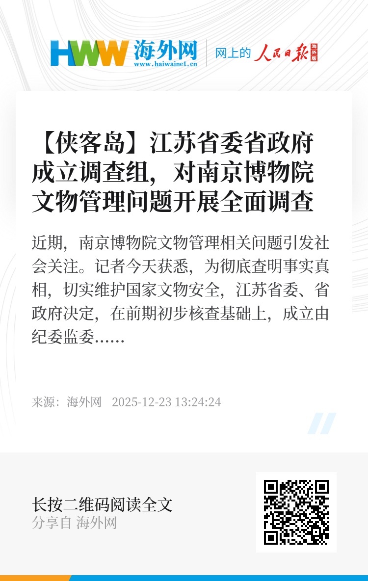 近期,南京博物院文物管理相关问题引发社会关注。记者今天获悉,为彻底查明事实真相,切实维护国家文物安全,江苏省委、省政府决定,在前期初步核查基础上,成立由纪委监委、宣传、政法、公安、文旅、文物等部门组成的调查组,对南京博物院受赠文物保管处置中存在的问题,以及其他藏品安全问题,进一步全面深入调查,并依据调查结果对违法违规问题进行严肃处理,绝不姑息。调查处理情况将及时向社会公布。