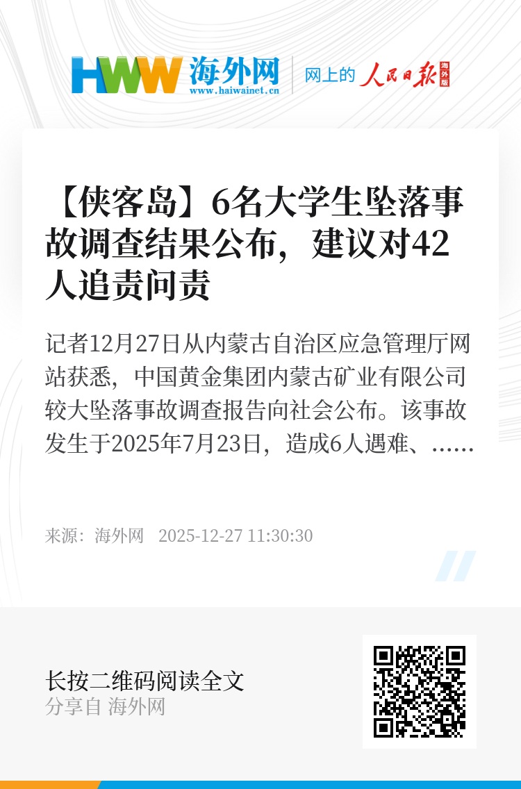 记者12月27日从内蒙古自治区应急管理厅网站获悉,中国黄金集团内蒙古矿业有限公司较大坠落事故调查报告向社会公布。该事故发生于2025年7月23日,造成6人遇难、1人受伤,经调查认定为一起较大生产安全责任事故。报告详细揭示了事故经过、原因及责任追究等情况。