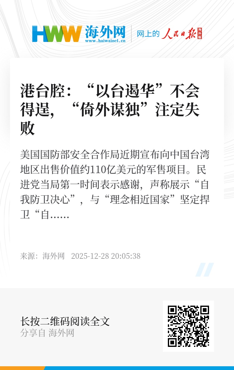 美国究竟是在“保台”还是“害台”,民进党当局究竟是在“护台”还是“毁台”,台湾民众当然看得越来越清楚。事实就摆在面前。在奉行 “美国优先”的山姆大叔眼中,台湾真正的价值就是“肥肉”“提款机”和遏制大陆的工具。美方通过军售武装台湾、收割经济利益,台湾愈发沦为战略博弈中被牺牲的“棋子”。但民进党当局却明知故犯、一意孤行,不管台湾安危、百姓死活,不惜败光家底,任由美方敲骨吸髓、吃干榨尽。这种为一己私利卖台、毁台的邪恶行径、卑劣本质已经引发台湾社会警惕和不满,在岛内大失民心。