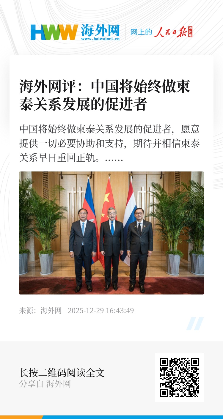 12月29日,中柬泰外长会晤在云南玉溪成功举行。三方会晤后发表新闻公报,从五个方面明确柬泰将进一步加强沟通,增进理解,循序渐进地巩固停火局面、恢复彼此交往、重建政治互信、实现关系转圜、维护地区和平。中国将始终做柬泰关系发展的促进者,愿意提供一切必要协助和支持,期待并相信柬泰关系早日重回正轨。
