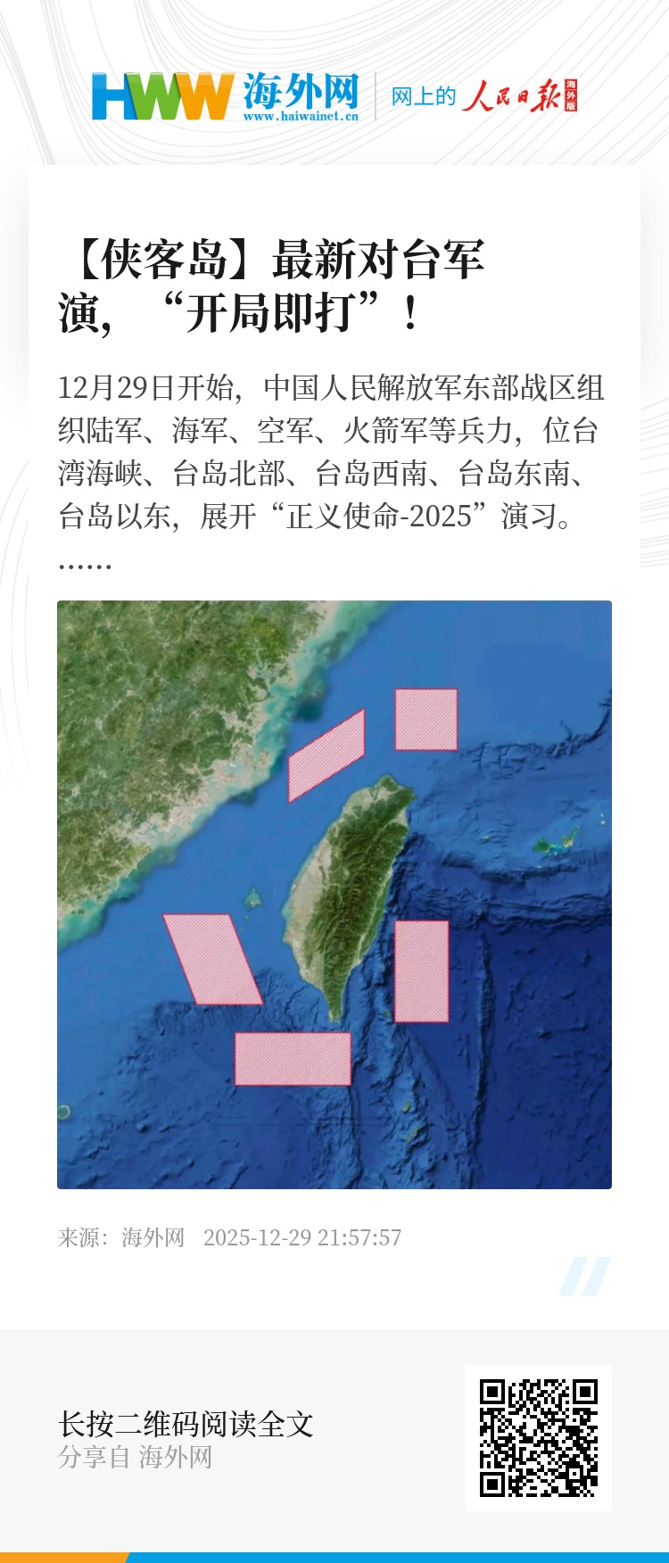 12月29日开始,中国人民解放军东部战区组织陆军、海军、空军、火箭军等兵力,位台湾海峡、台岛北部、台岛西南、台岛东南、台岛以东,展开“正义使命-2025”演习。
