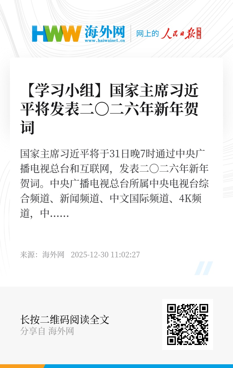 原标题/国家主席习近平将发表二〇二六年新年贺词