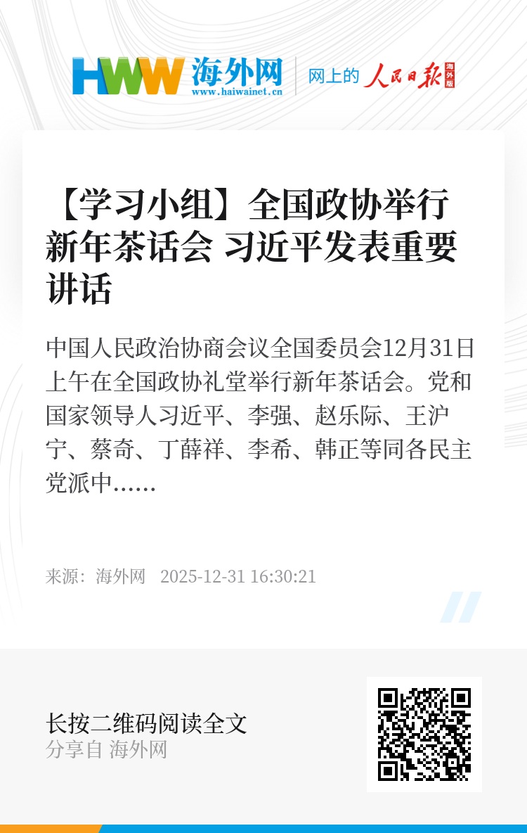 中国人民政治协商会议全国委员会12月31日上午在全国政协礼堂举行新年茶话会。党和国家领导人习近平、李强、赵乐际、王沪宁、蔡奇、丁薛祥、李希、韩正等同各民主党派中央、全国工商联负责人和无党派人士代表、中央和国家机关有关方面负责人以及首都各族各界人士代表欢聚一堂,共迎2026年元旦。