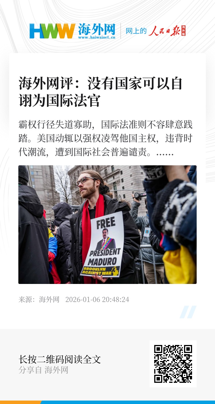 没有国家可以充当国际警察,没有国家可以自诩为国际法官。须知,《联合国宪章》明确确立了国家主权平等、不干涉内政、禁止使用武力等基本原则,这是维系国际秩序稳定的基石。任何国家都不能将本国的规则凌驾于国际法之上。当今世界冲突频发,需要的是更多治理而非破坏。反观美国,作为联合国安理会常任理事国,美国本应是国际秩序的维护者,却无视国际社会严重关切,肆意践踏委内瑞拉主权、安全和合法权益,强行控制一国现任总统,再次让世界彻底看清了美国“强权即公理”的霸道逻辑、“弱肉强食”的丛林法则,以及践踏国际法、惯于扮演“国际裁判”的虚伪面目。“先前曾有一些时期,如越南和伊拉克(战争)……那时的美国领导人对外传达信息还以民主为遮掩。”美国印第安纳波利斯大学历史学家爱德华·弗朗茨说,“而本届美国政府现在的表达方式是我们长久以来未曾见过的”,让人想起“炮舰外交”。