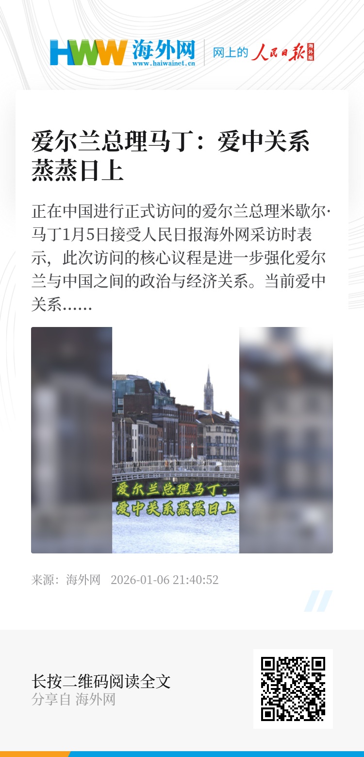 正在中国进行正式访问的爱尔兰总理米歇尔·马丁1月5日接受人民日报海外网采访时表示,此次访问的核心议程是进一步强化爱尔兰与中国之间的政治与经济关系。当前爱中关系蒸蒸日上,合作前景广阔。